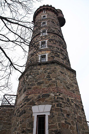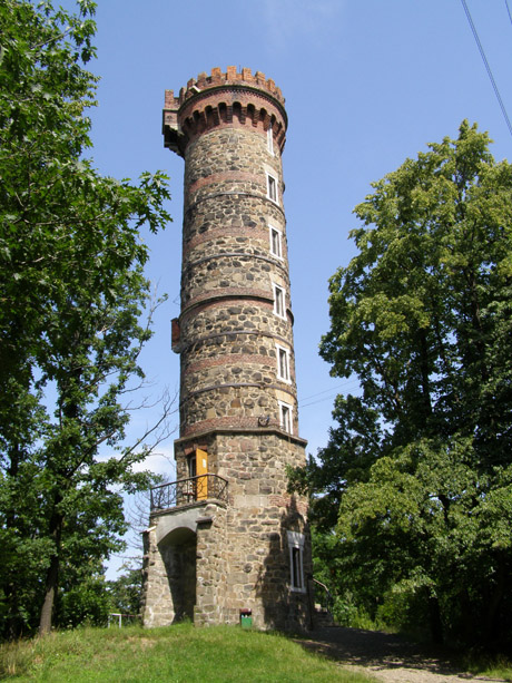Na začátku 20. století byla vyla budována podle projektu architekta Ernsta Latzela. Nad základní válcovou věží s vyhlídkovou plošinou ve výšce 25 m se totiž zvedala ještě úzká boční věžička, která kryla východ schodiště a zároveň umožňovala jednomu či dvěma lidem kruhový rozhled z místa ještě o pět metrů vyššího. Při otevírací slavnosti, konané 11. června 1903, dostala jméno Liechtensteinova rozhledna na počest bohatého mecenáše, bez jehož významného knížecího daru by výstavba nebyla možná.